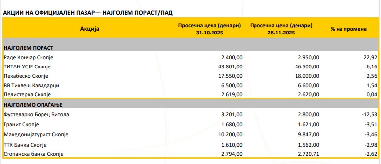 Акцијата на Раде Кончар има најголем раст, а акцијата на Фустеларко Борец има најголем пад во ноември, покажува билтенот на Македонската берза за овој период.
