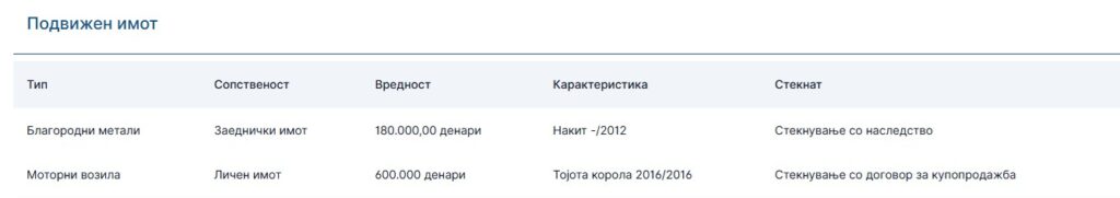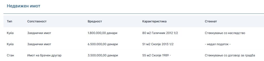 На свое име нема недвижен имот. Како заеднички пријавил имот во Скопје и Галичник.