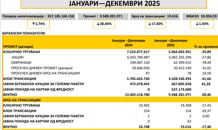 Прометот на Македонската берза лани изнесувал 9,5 милијарди денари и истиот бележи пад од 28,46%, покажува годишниот билтен на Берзата.