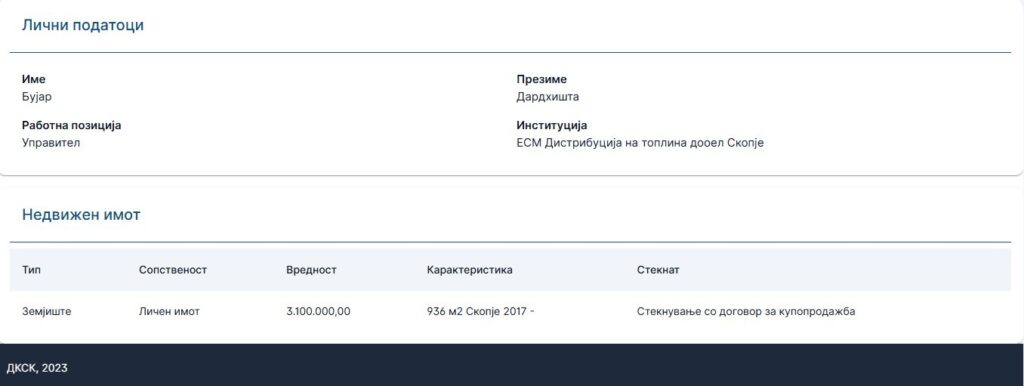 еМагазин разгледа каков имот пријавил Дардишта, кадар на опозициската ДУИ, до Антикорупциската комисија, кога бил управител во ЕСМ Дистрибуција на топлина ДООЕЛ Скопје.