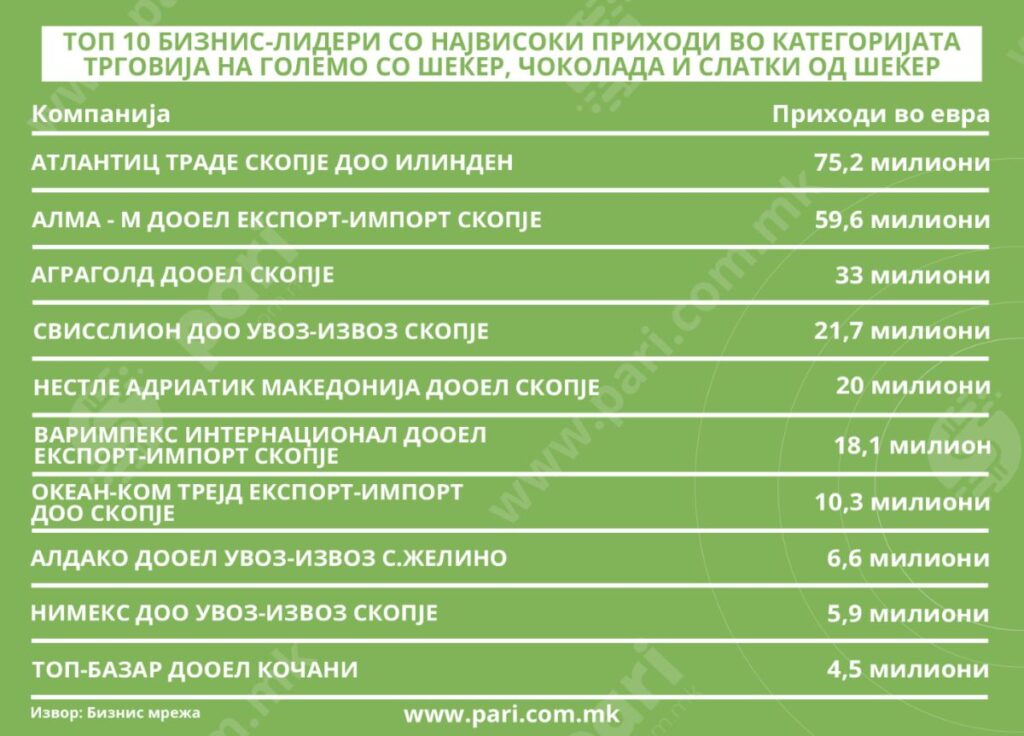 Десет компании од секторот трговија со шеќер, чоколада и слатки од шеќер лани оствариле вкупен приход од речиси 255 милиони евра, покажува анализата на порталот „Пари“ направена во соработка со Бизнис Мрежа.