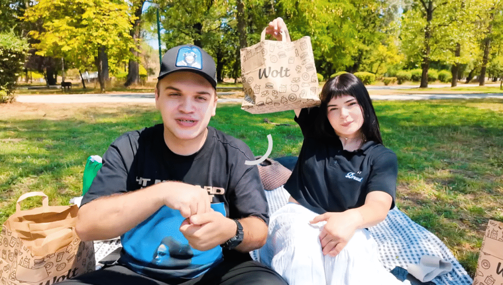 Инфлуенсерите Александра Трпеска ака majestic.at и Стефан Рашковиќ ака Steffonator уживаа во предизвикот „Погоди што јадеш без да гледаш“. Локацијата е Градскиот парк во Скопје, а појадокот го донесе курир-партнер на Wolt.