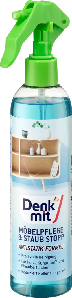 За површини кои сакате да блескаат подолго, тука е Denkmit спрејот за мебел и прашина, 300 мл, по цена од 129 денари. Неговата антистатична формула чисти, негува и го штити дрвото, вештачките материјали и стаклото, додека истовремено го одложува повторното создавање прашина и ги намалува поленските алергени. Без восок, без траги – само чисти и сјајни површини кои траат.