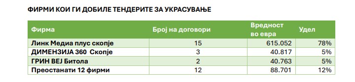 Повеќе од еден договор добиле уште две фирми, Димензија 360 од Скопје за општините Валандово, Гевгелија и Дојран, како и фирмата Грин веј од Битола, која освен со Општина Битола склучила договор за украсување и со Општина Ресен.