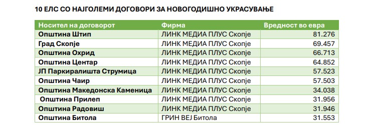 Од вкупно склучени 32 договори за новогодишно украсување на општините, дури 15 се со Линк Медиа Плус, покажува истражувањето на Центарот за граѓански комуникации (ЦГК).