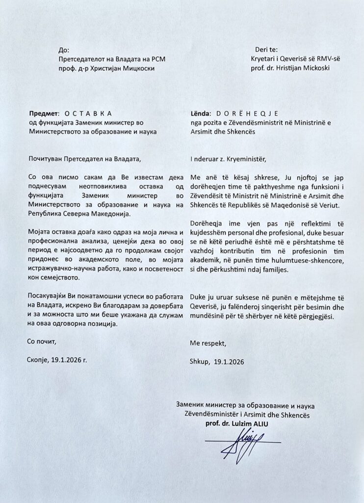 Лулзим Алиу, од владејачката коалиција Вреди, од партијата Алтернатива, поднесе неотповиклива оставка од позицијата заменик-министер за образование и наука.