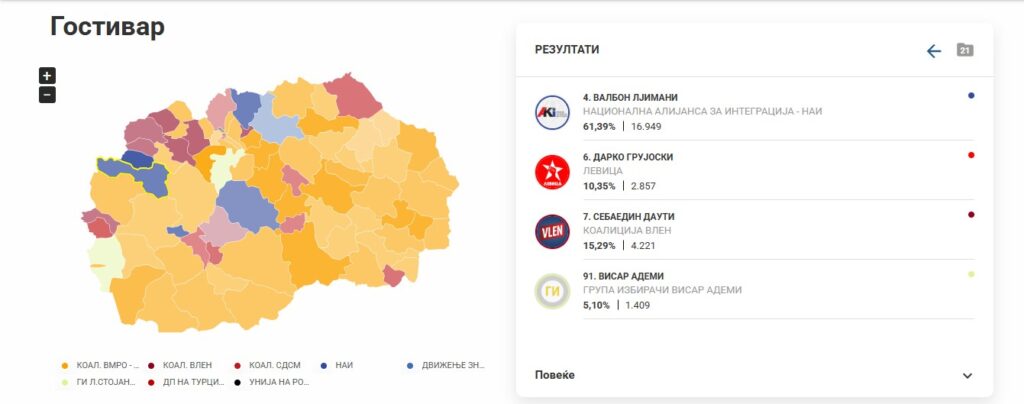 Втор беше Себаедин Даути, кандидат на коалицијата Вреди, кој освои 15,29% од гласовите.