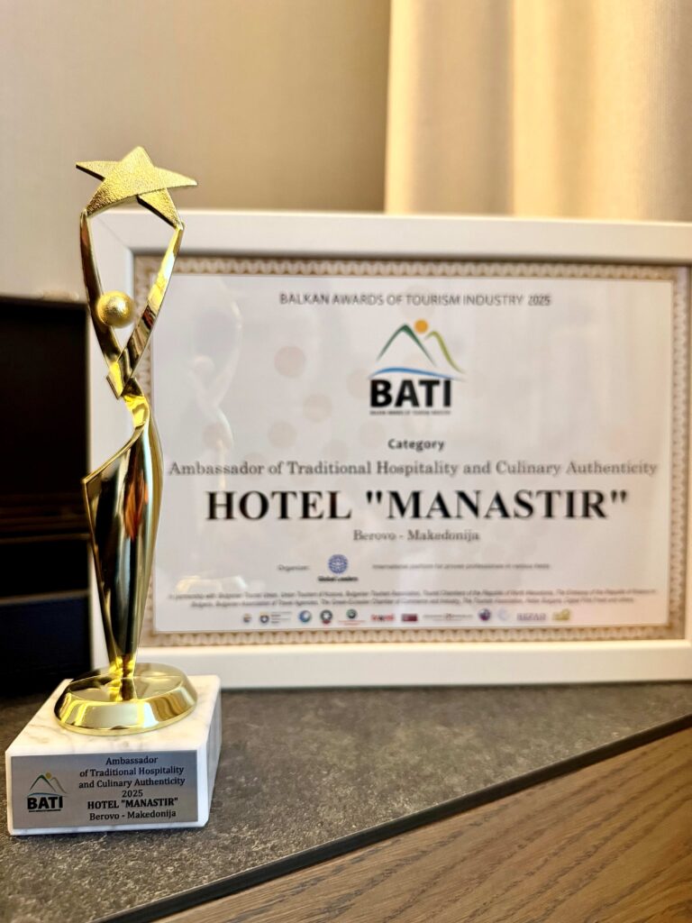 Хотел Манастир од Берово ја понесе престижната титула „Амбасадор на традиционалното гостопримство и кулинарна автентичност“ на врвниот регионален настан Balkan Awards of Tourism Industry 2025, одржан во Софија, во конкуренција со водечки хотели од Македонија, Бугарија, Грција, Србија и Косово.