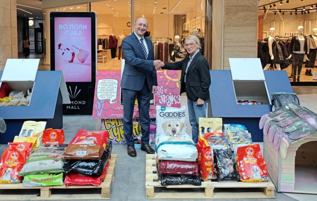Јавното претпријатие „Лајка“ доби 600 килограми храна за кучиња и 10 рачно изработени куќички за кучиња, a донацијата беше обезбедена преку активностите организирани по повод вториот роденден на Diamond Mall, информираат од таму.