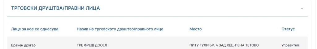 Неговата сопруга е управител во трговското друштво Тре фреш ДООЕЛ Тетово.