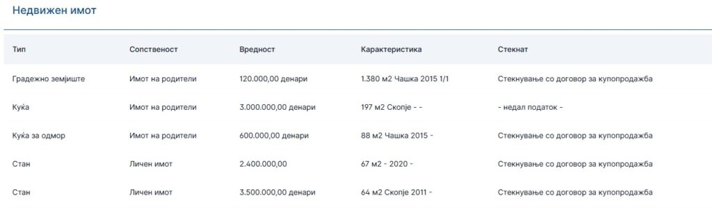 На име на родителите пријавил две куќи во Чашка, како и градежно земјиште.