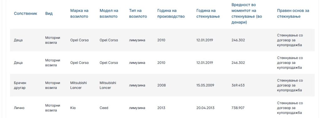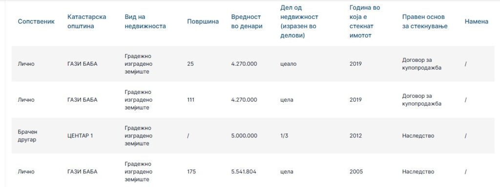На свое име пријавила недвижен имот во скопска Гази Баба, а на име на сопругот во Центар.
