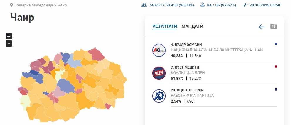 Актуелниот прв вицепремиер и министер за животна средина и просторно планирање, Изет Меџети, кандидат на владејачката коалиција Вреди, е новиот градоначалник на скопската општина Чаир.