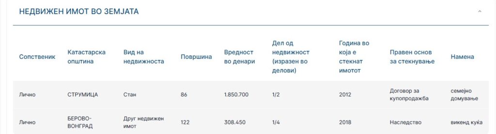 На свое име има стан во Струмица, како и викенд куќа во Берово, од наследство.