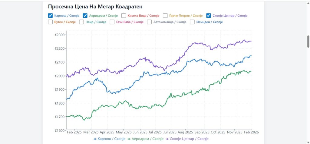 Просечната цена на квадрат во Центар и Карпош надминува 2.000 евра, а и во Аеродром се приближува до таа сума.