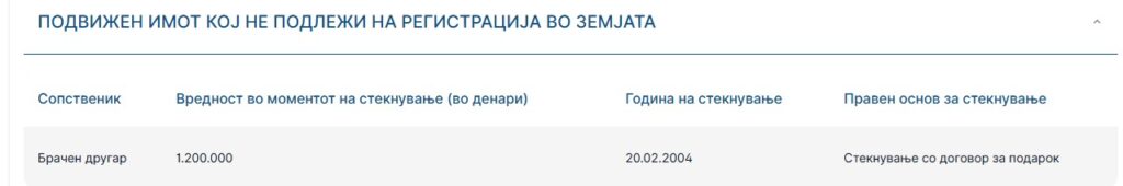 На име на сопругата пријавил подарок од 1,2 милион денари.