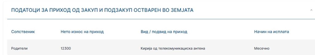 На име на родителите пријавил и приходи од закуп за телекомуникациска антена.