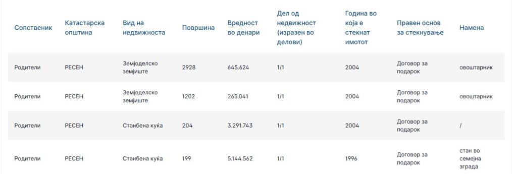 На име на родителите пријавил недвижен имот во Ресен и викенд куќа во Коњско.