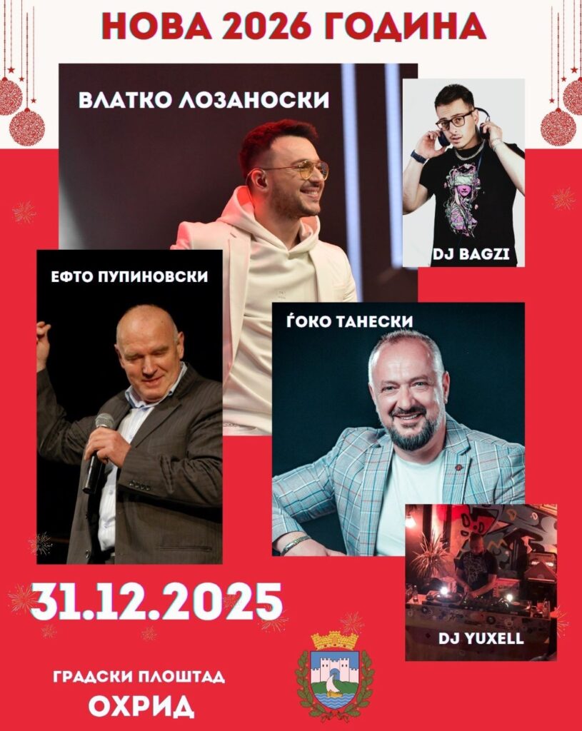 На 31. декември на Градскиот плоштад „Свети Климент Охридски“ за дочекот на Нова Година ќе настапат Влатко Лозановски, Ефто Пупиноски, Ѓоко Танески, DJ Yuxell и DJ Bagzi.