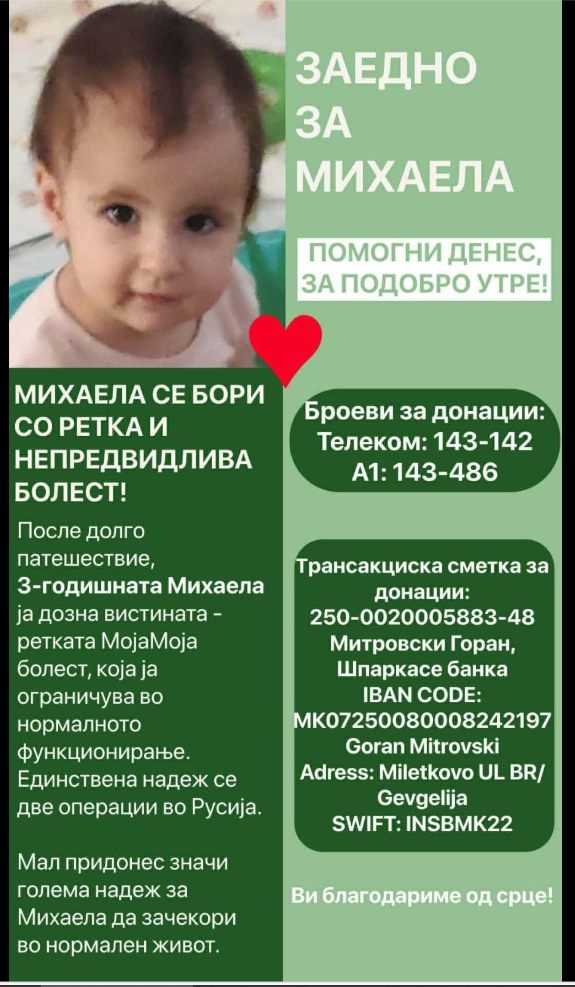 Тригодишната Михаела има ретка болест која ја попречува нормално да функционира. Оттука потребни се средства, за операција во Русија.
