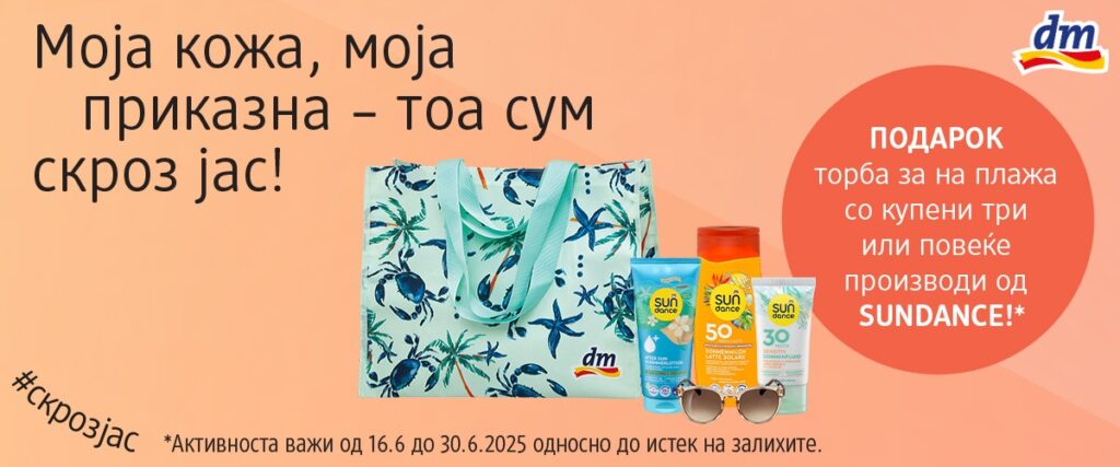 Летото е тука, а со него и моментите на опуштање под сончевите зраци! Ова лето, dm ви нуди уникатна можност да ја направите вашата авантура на плажа уште поубава. Со купување на 3 или повеќе производи за заштита од сонце и очила на Sundance, добивате подарок – убава и практична торба за плажа! Активноста важи до 30 јуни, односно до истек на залихите.