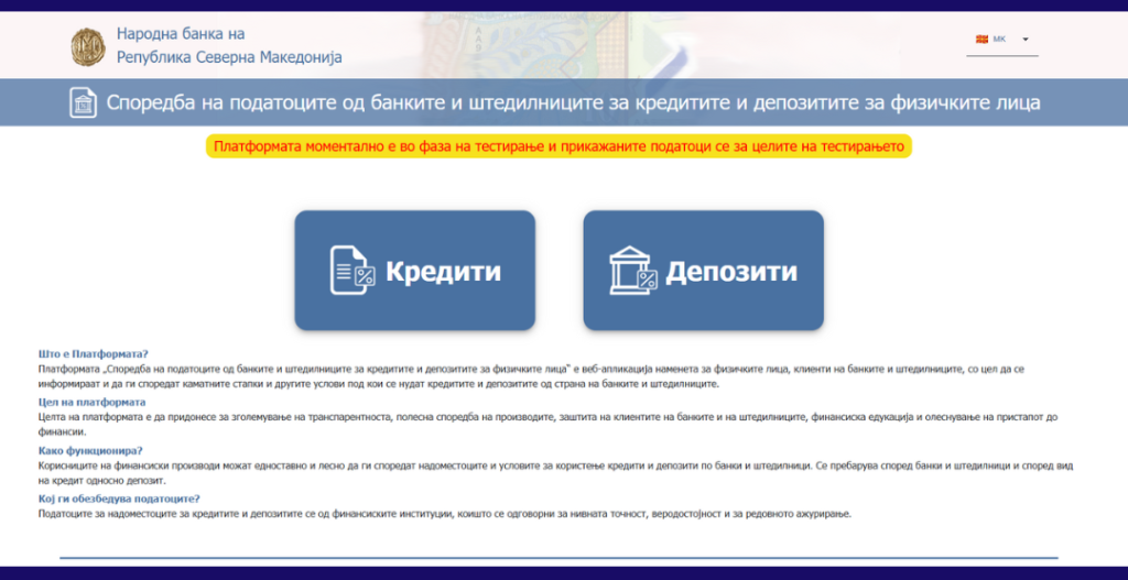 Апликацијата овозможува брз и прегледен увид во каматните стапки и другите важни услови под кои се нудат кредитите и депозитите, со цел граѓаните да можат да донесат финансиска одлука заснована на информации и според нивните лични потреби и можности.