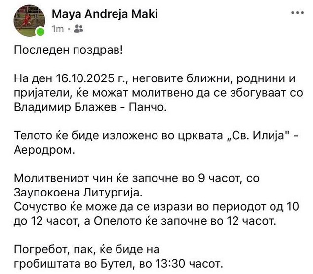 Деталите на социјалните мрежи ги соопшти неговата сопруга Маја Блажев.