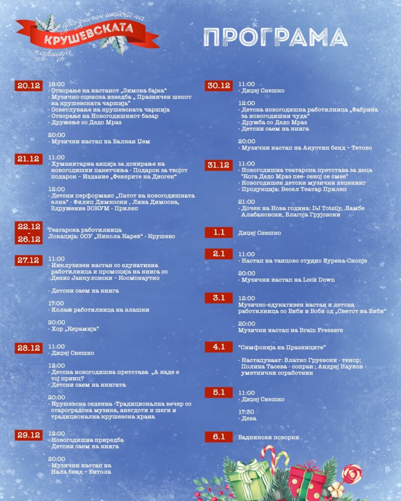 Дрвени лампиони со зимски илустрации, дрвени елки и новогодишни фигури, како и природни елки, создадени од крушевчани. Чаршијата ќе понуди вистинско празнично доживување со измешани вкусови и мириси на традиционална храна, крушевски колбаси, ќебапчиња и питулици со лук, планински чај и варено вино, а истовремено посетителите ќе имаат можност да купат уникатни ракотворби и уметнички производи од локални креативци кои ќе бидат дел од Новогодишниот базар.
