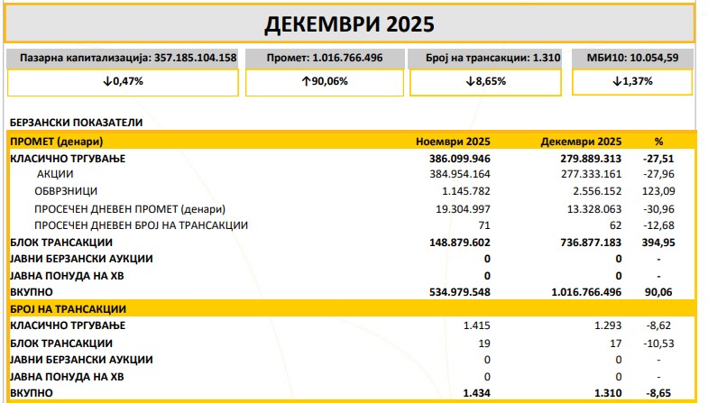 Раст на прометот од 90,06% бележи Македонската берза во декември, покажува билтенот, кој го објави Берзата.