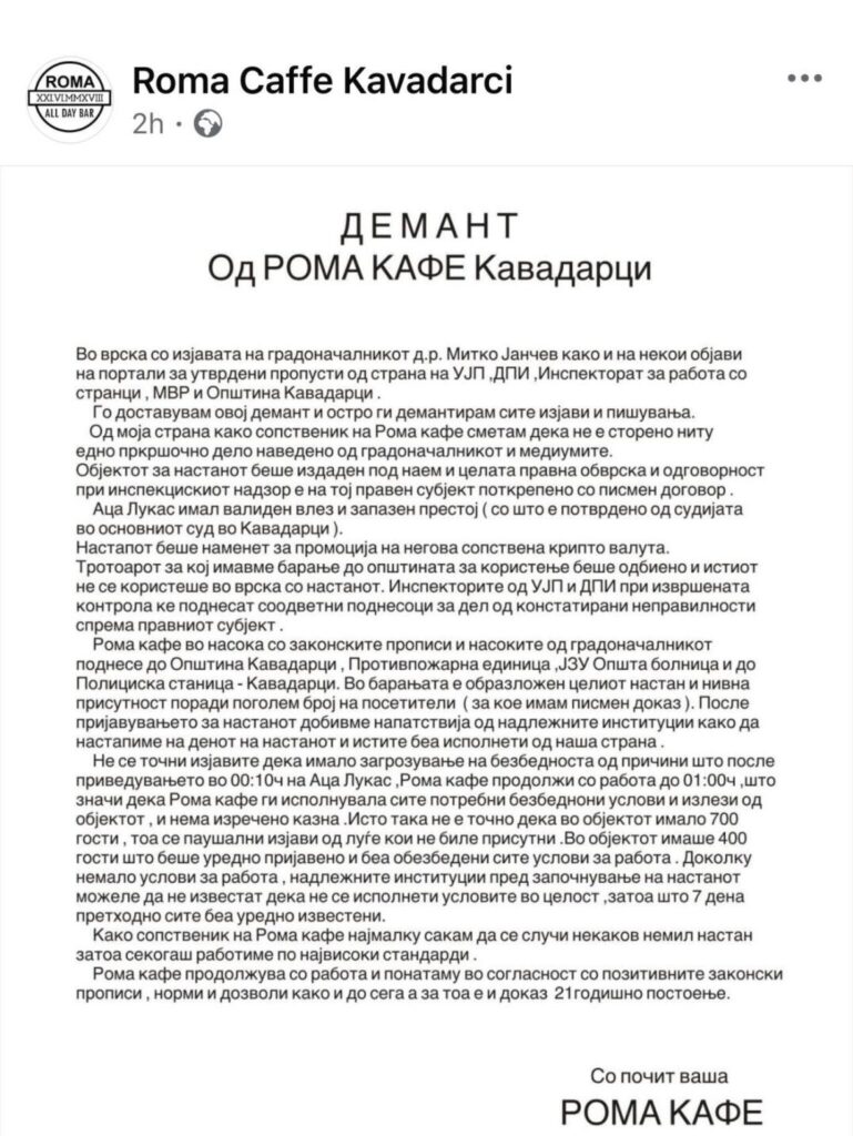 За приведувањето на српскиот турбо-фолк пејач Аца Лукас (Александар Вуксановиќ) на настап во локалот „Рома кафе„ во Кавадарци со демант реагираше и сопственикот на локалот.