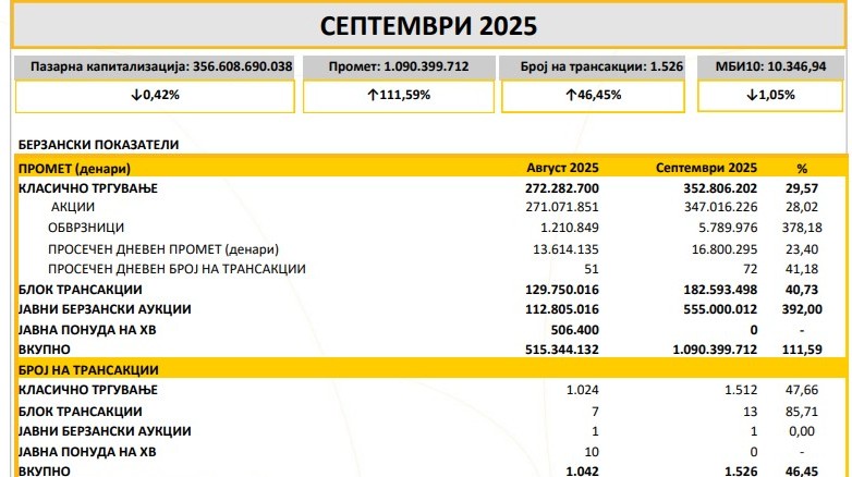 Во септември прометот на Македонската берза бележи раст од 111,59% и изнесува над 1 милијарда денари, покажува билтенот на Берзата.