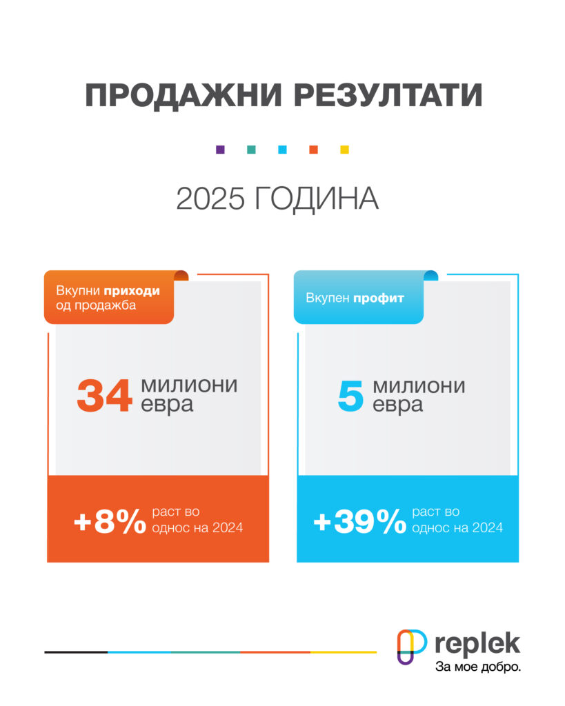 Вкупните приходите од продажбите на „Реплек“ во периодот од 1 јануари заклучно со 31. декември 2025 година изнесуваат 34 милиони евра, што претставува раст од 8% во споредбата со 2024 година, и е доказ за континуираната динамика на раст и стабилното пазарно присуство на компанијата, подвлекуваат од таму.