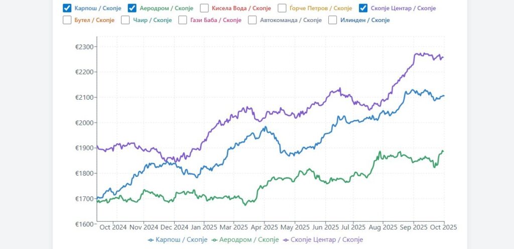 Највисока е цената на становите во општините Карпош, Центар и Аеродром, каде просечната цена оди и до околу 2.300 евра.