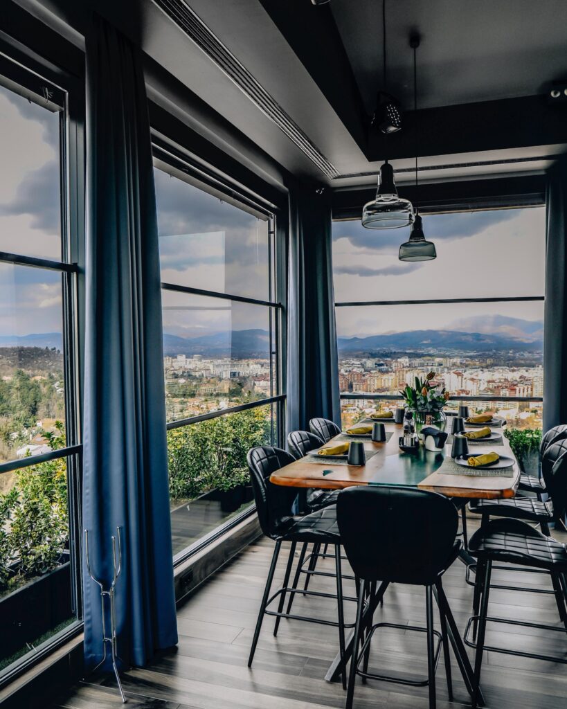 Ресторан со најубавата панорамска глетка на Скопје. Скриено од урбаниот метеж и градската бучава, ова е место каде ќе ја пронајдете дефиницијата за удобност и квалитет. Модерен ресторан идеален за склучување бизнис договори, за оставање впечаток пред партнерите и соработниците, за започнување љубовни приказни, за создавање пријателства. Барот има сопствена кујна со внимателно одбрано мени, кое ќе го задоволи сечиј вкус, па дури и на оние кои сакаат нешто луксузно Wagu Ribay стек.