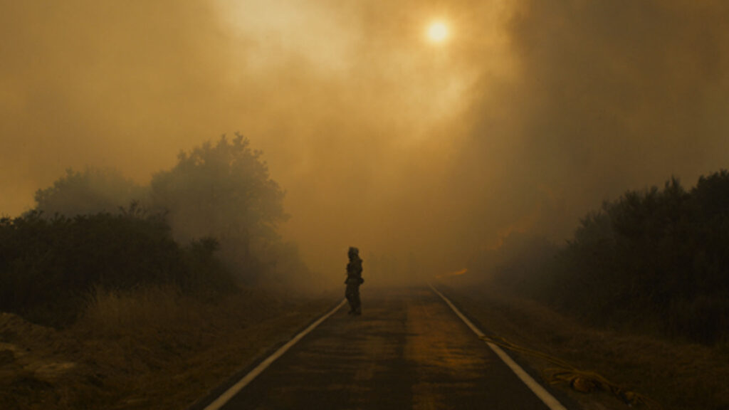 Долгометражниот документарен филм „Само на земјата“ (Данска, Шпанија/2025/92 мин.) на Робин Петре е неверојатно примамливо и визуелно впечатливо патување во Јужна Галиција, една од најранливите зони на шумски пожари во Европа. За време на најжешкото лето досега, и луѓето и животните се борат со околностите како што наближуваат неизгасливите пожари.