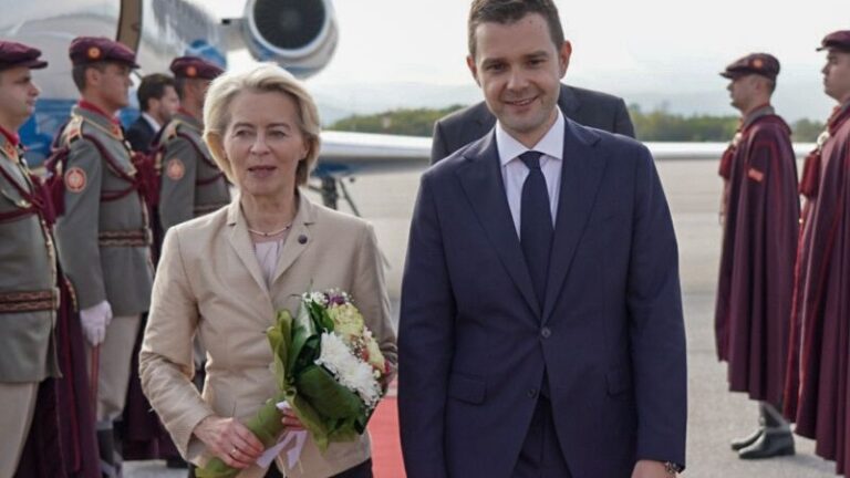 Во Скопје попладнево пристигна претседателката на Европската комисија, Урсула фон дер Лајен, која со посетата на Македонија ја завршува својата кратка турнеја по земјите од Западен Балкан. На скопскиот аеродром ја пречека министерот за надворешни работи и надворешна трговија, Тимчо Муцунски, а таа ќе има средби со премиерот Христијан Мицкоски,