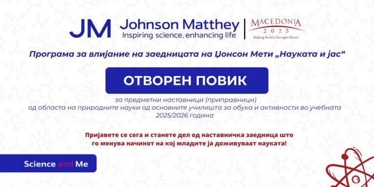 Македонија2025, во рамки на Џонсон Мети Програмата за поддршка на заедницата„Науката и Јас“, го објавува новиот повик за предметни наставници по природни науки (природни науки, биологија, хемија, физика) од основните училишта во земјата. Повикот е отворен до 20. октомври 2025 година. Кој може да аплицира? Што нуди обуката? Слободно пишете