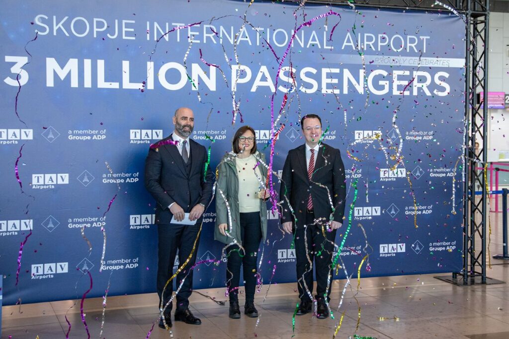 Генералниот директор на ТАВ Македонија, Неџат Курт и вицепремиерот и министер за транспорт, Александар Николоски ја изненадија 3 милионититата патничка додека се пријавуваше на летот Скопје – Бари, информирајќи ја дека токму таа го одбележува значајниот момент за скопскиот аеродром и дека ќе добие награда.