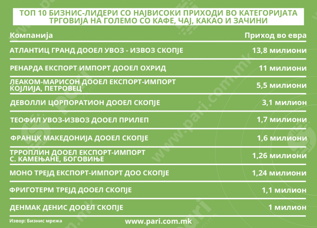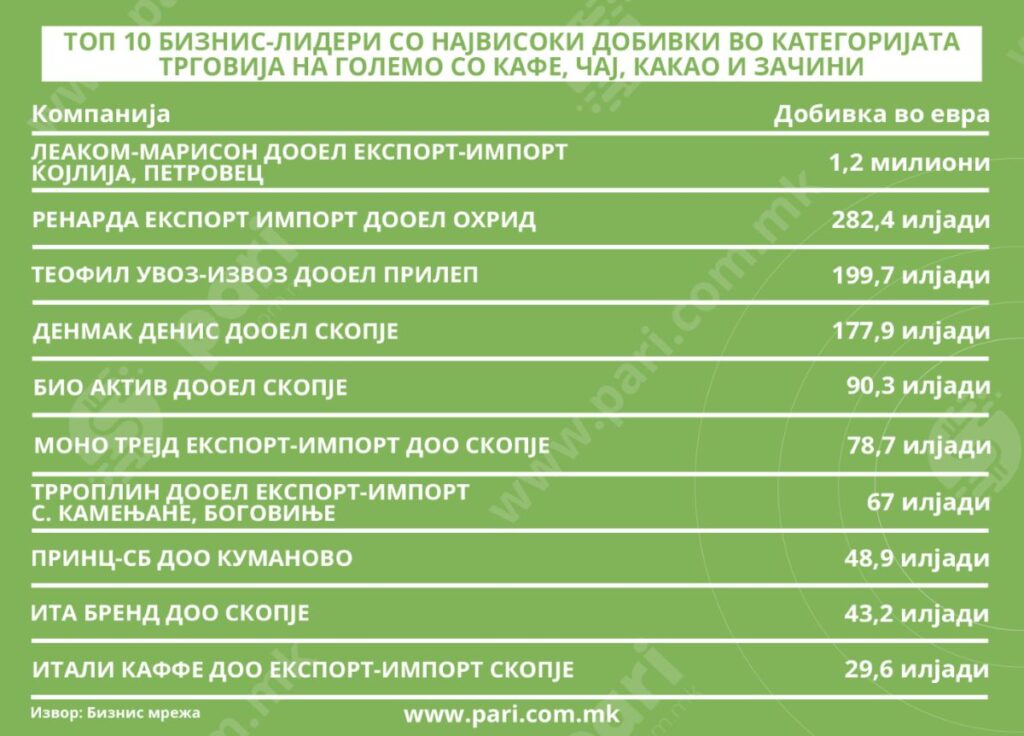 Десет компании од секторот трговија со кафе, какао, чај и зачини лани оствариле приходи од 41,3 милиони евра и добивка од 2,1 милиони евра покажува анализата на порталот Пари, направена во соработка со Бизнис мрежа.