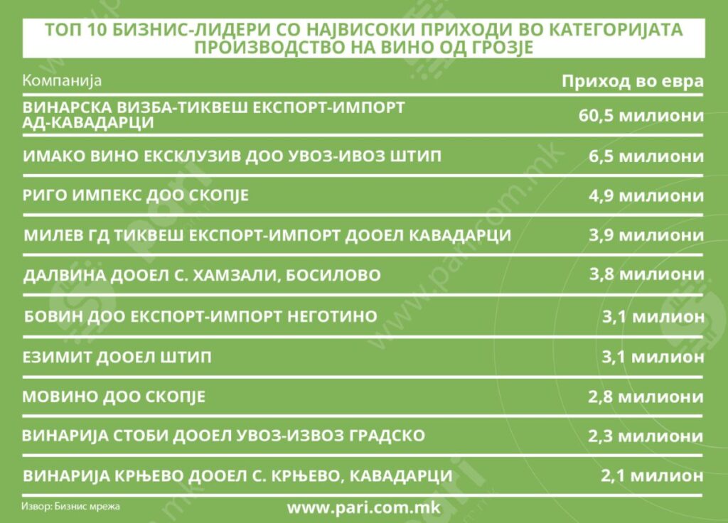 На врвот според приходи е винарската визба Тиквеш АД Кавадарци, со 60,5 милиони евра.