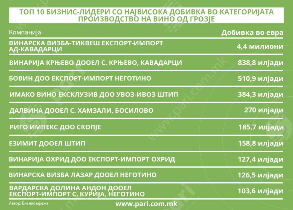 Анализата на порталот Пари, направена во соработка со Бизнис Мрежа, покажува дека 10. винарници во Македонија лани оствариле вкупен приход од 93 милиони евра и добивка од 7,1 милион евра.