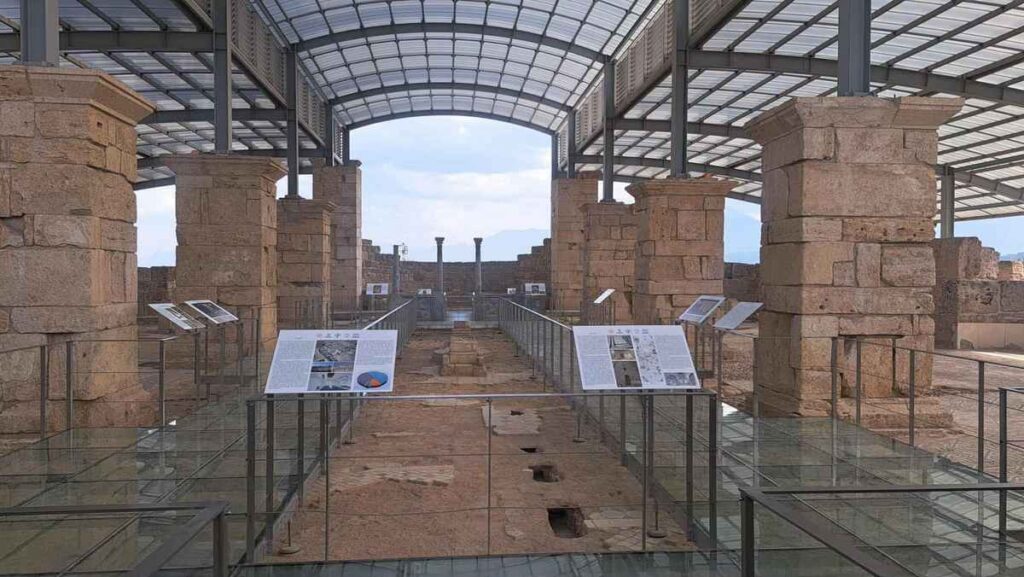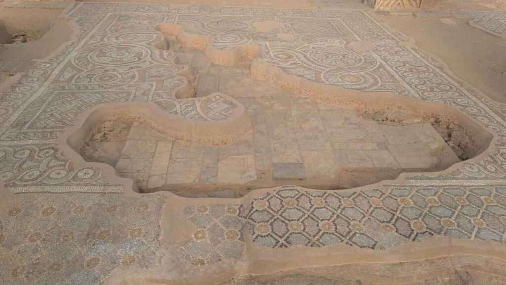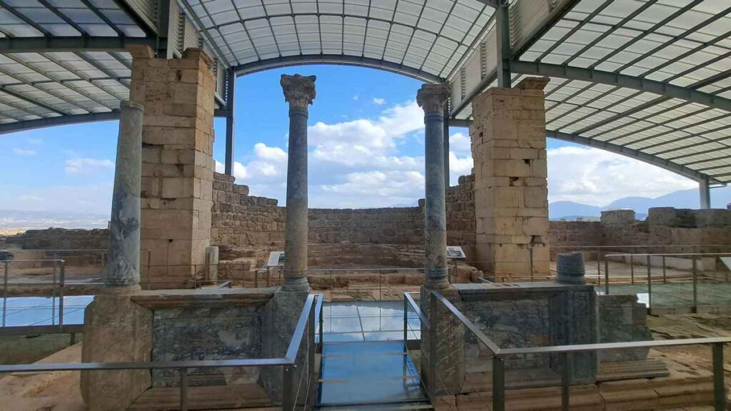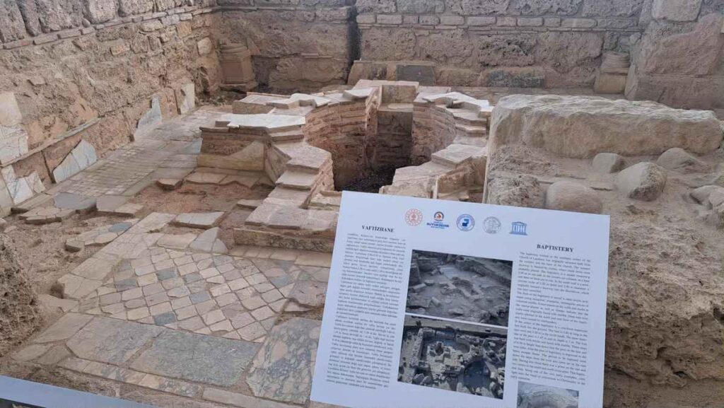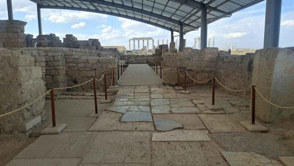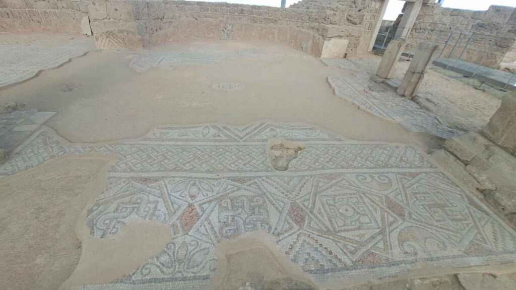 Чекоревме по нејзините остатоци, низ специјално направени стаклени мостови а од кои се гледаат мозаците, се доаѓа до олтарот, до крштелницата..