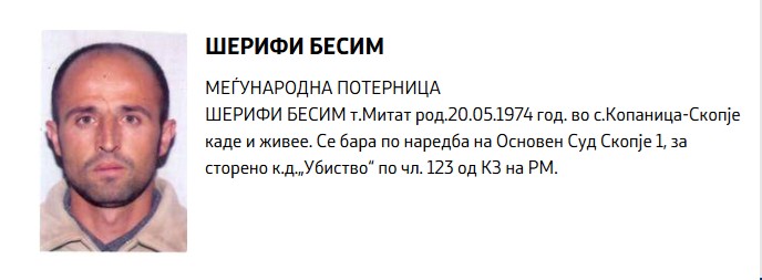Во Тирана, Албанија е уапсен македонскиот државјанин Бесим Шерифи (52) од селото Копаница, Општина Сарај, кој во Македонија се бара за тројно убиство.